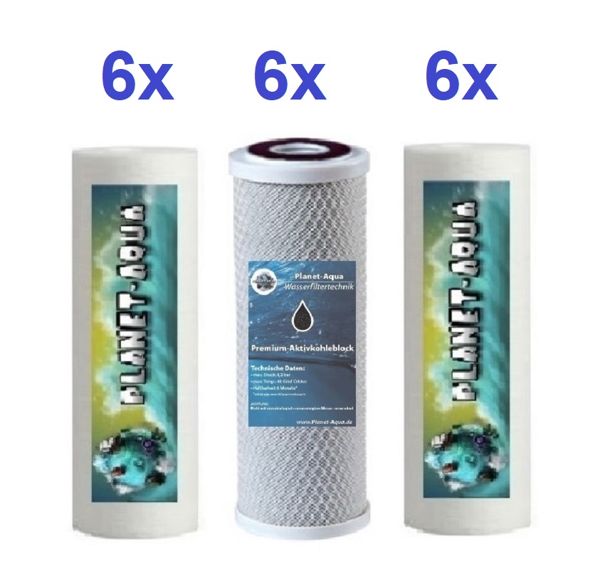 6 x Sediment Schaumfilter 10 Zoll mit 1 Mikron, 6 x Sedimentfilter 10 Zoll mit 5 Mikron und 6 x Aktivkohle-Block 10 Mikron Filterfeinheit