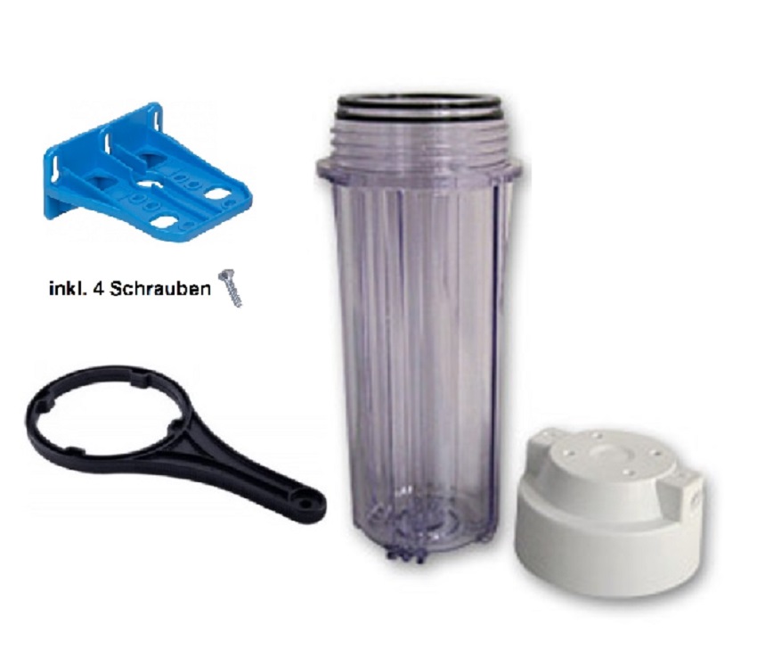 Filtergehäuse 10 Zoll transparent inkl Wandhalter und Filterschlüssel für Wasserfilter Osmoseanlage Umkehrosmose