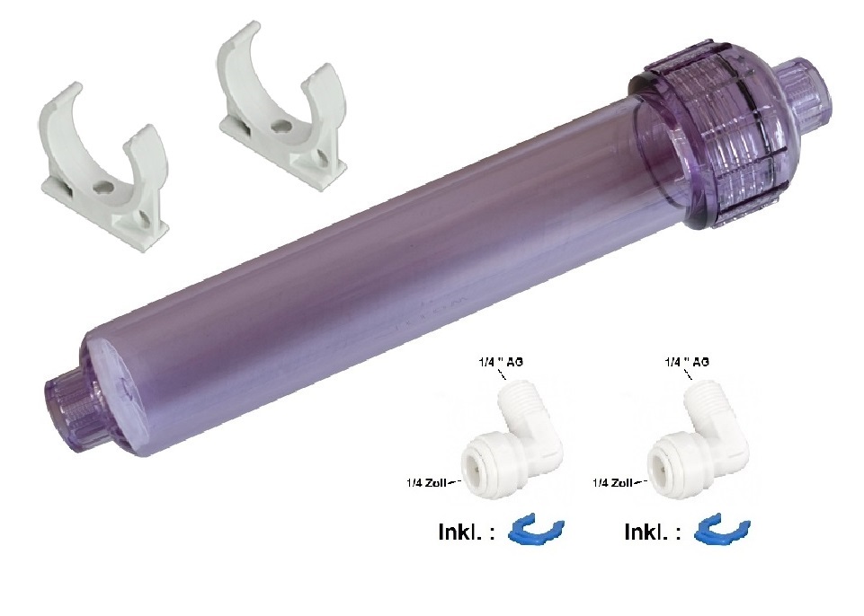 Lieferumfang der Inline Leerfilter Patrone 12 Zoll mit Adapteranschluss und Halterungen für die Osmoseanlage: