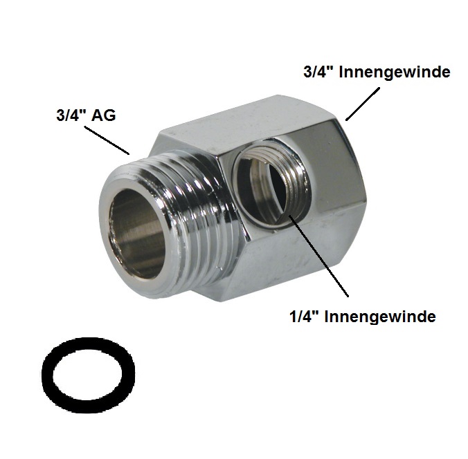 - Messinganschluss 3/4″ Innengewinde x 3/4″ Aussengewinde x 1/4″ Innengewinde an der Seite inkl. Dichtung