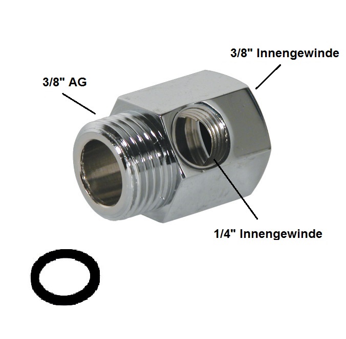 - Messinganschluss 3/8″ Innengewinde x 3/8″ Aussengewinde x 1/4″ Innengewinde an der Seite inkl. Dichtung