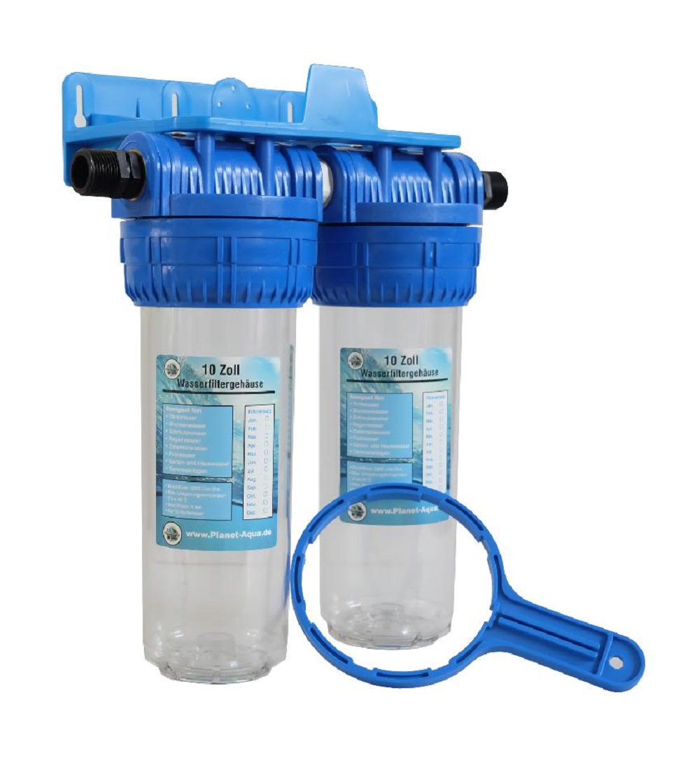 Planet-Aqua Wasserfilter Filtergehäuse Duo XL 10 Zoll Gehäuse inkl Wandhalterung Anschlussadapter und Schlüssel für