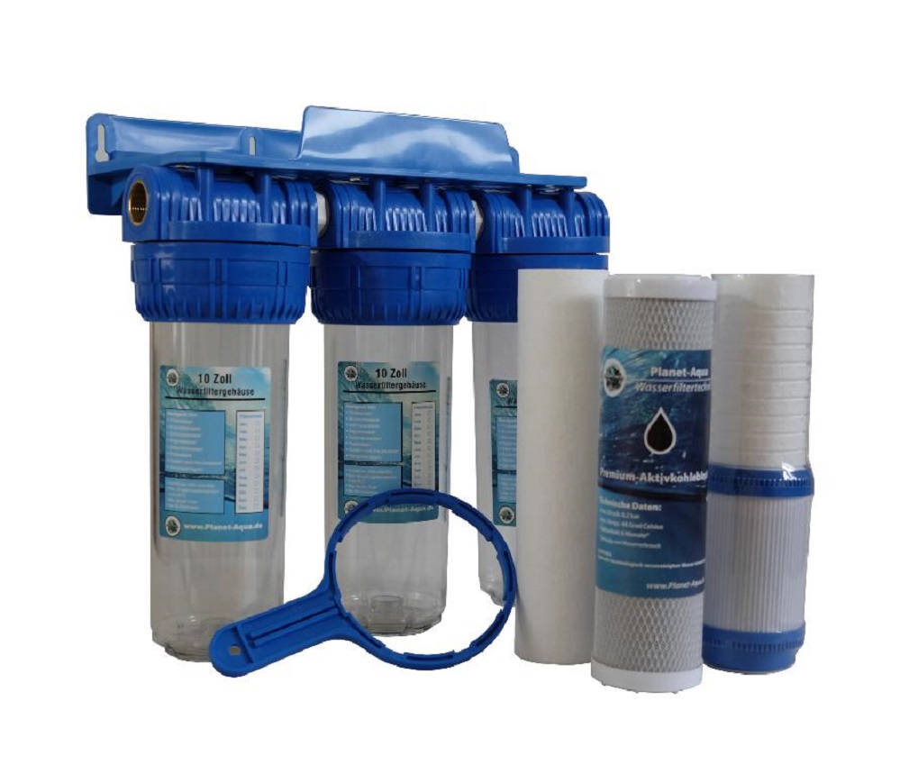 Planet-Aqua Wasserfiltergehäuse SET TIO-6 Filtergehäuse 10 Zoll inkl Schaumfilter Kombifilter und Aktivkohleblock